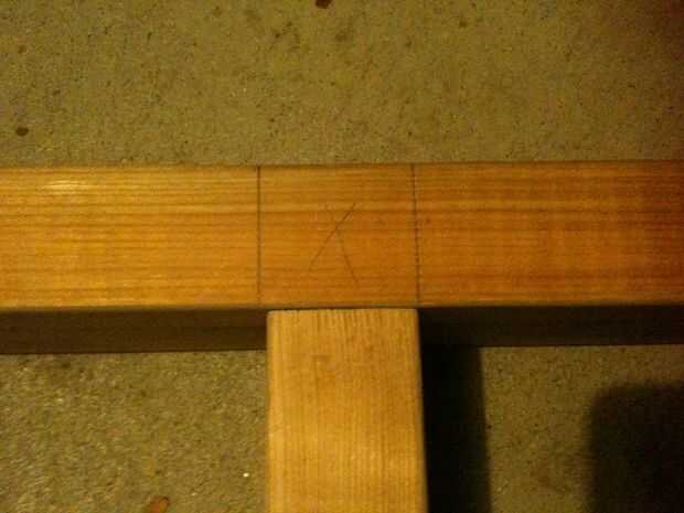 · Alinee el travesaño a la viga en las marcas y poner un clavo o tornillo en el empalme del primero.