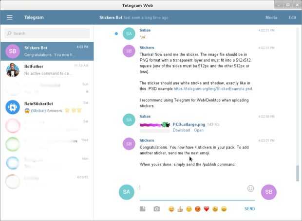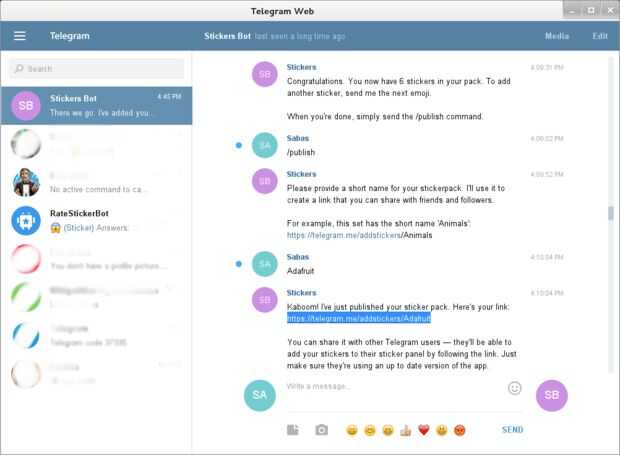 con esto el robot pedirá el nombre llevara la dirección URL donde se podrán descargar un telegrama los stickers y agregaro a la colección de pegatinas personales, con esta URL podrás inscribirse a tus amigos y ellos tambien podran descargar los stickers