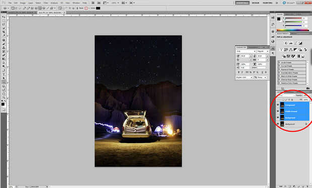 Crear un archivo de photoshop con las tres imágenes que ha tomado, en capas. Cualquier capa en la parte superior es la capa que se verá, sin embargo el orden no importa ya que ellos finalmente se combinarán todos modos.