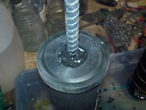 El electrolito debe ser mojado... porque el filtro es naturalmente "leaky" - el agua se mueve a través de él, tienes que instalar una bomba para mantener circulación de electrolito a través del sistema. Falta poner paño o algo similar en allí, decidí poner carbón activado, que también ayuda a conducir la electricidad al ánodo metal.
