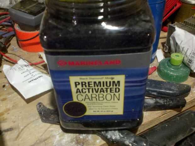 El carbón activado está disponible en su tienda local de mascotas en la sección de acuario. Llené los tubos lo mejor que pude, tener que mover la plancha para obtener el carbón a caer en su lugar.