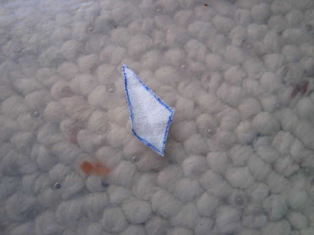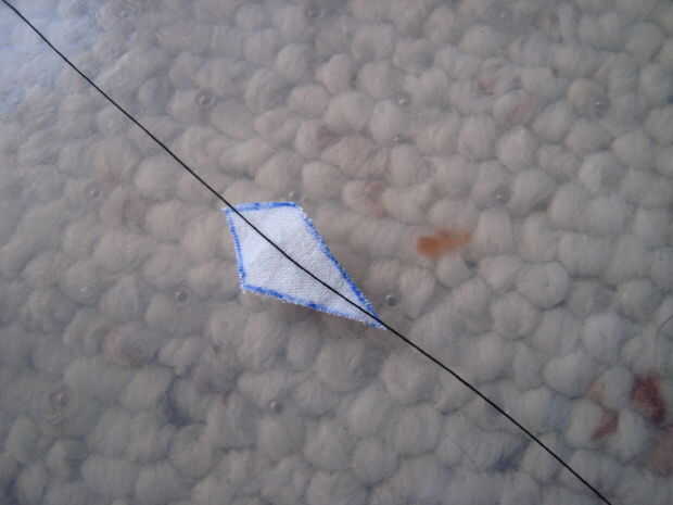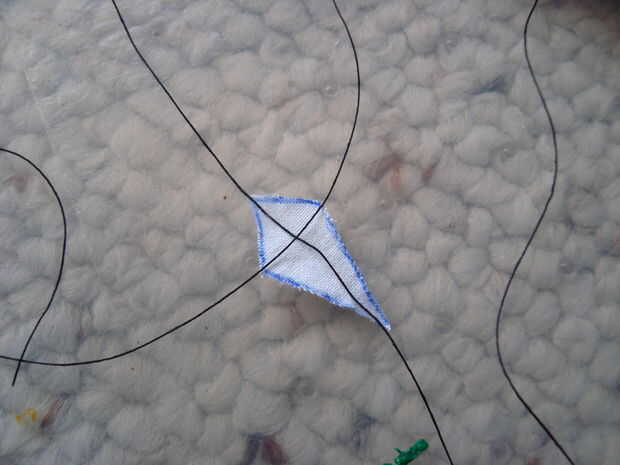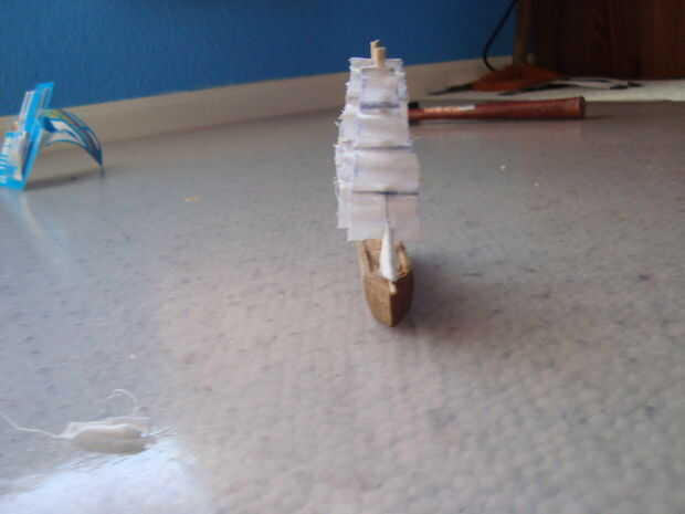 Ahora dibujar una forma pequeña cometa en su paño y recortarlo. Tomar alguna cadena y línea de esquina a la esquina opuesta y encolarla, dejando exceso de ambas esquinas. Lo mismo para las otras 2 esquinas. Tome el extremo con el triángulo más pequeño (parece > con una cadena unida) y corte el exceso de cordel excepto un poco (~.5 mm). Pegue ese pequeño pedazo de cuerda en la punta pokey de la nave, un poco más allá de la punta real del barco. Medir la distancia de la cuerda en la otra esquina opuesta (debería parecerse a < pero más larga) hasta la mitad de la barra de la vela inferior del mástil delantero. Cortar la cadena longitud y pegamento de la punta de la cuerda para que in situ (cuadro). Ahora en cada lado, tomar el exceso de cordel, estirarlo hacia atrás y pegar dentro de la embarcación, luego recortar el exceso de cordel. ¡ Yay, vela delantera hecha!