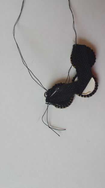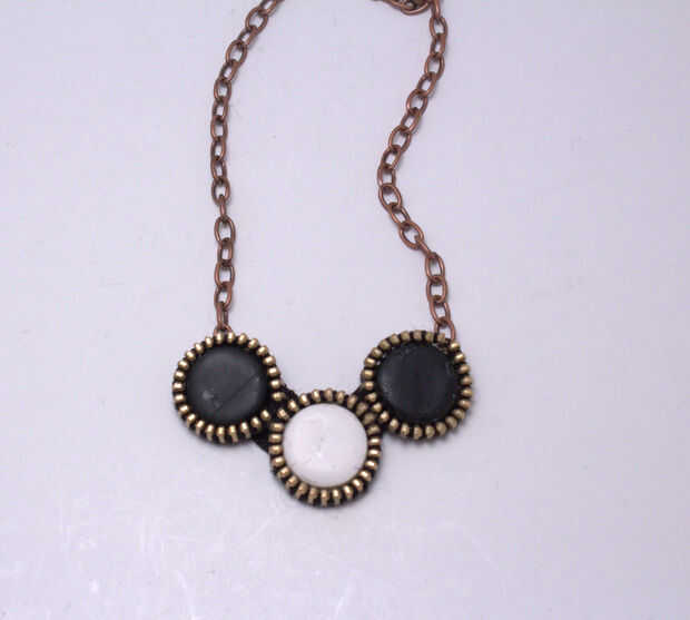 Ahora que las piezas se cuecen al horno, usted puede empezar a ser creativo, puede utilizar varios materiales, para hacer el negro y al collar de burbuja utiliza la tela restante de la cremallera, super pegados los granos de arcilla a él y cosido saltar aros en ambos lados