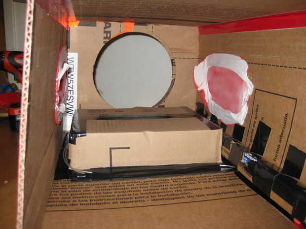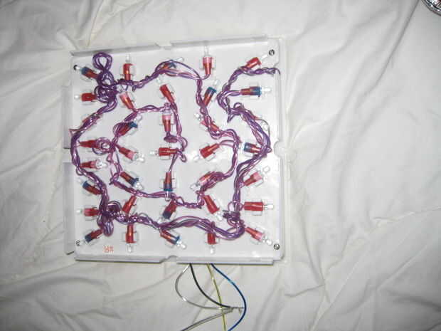 Puesto que el cuadro se completa básicamente, concentrémonos en las luces internas. He creado una caja de luz midiendo el tamaño de la ventana, y luego hacer una caja cabrían sobre la ventana desde el interior. La clave es asegurarse de que la caja es aproximadamente 3" de profundidad. Esto permite que el cableado y luces que se pegan en la parte posterior de la caja de luz. He creado un arnés de cableado juntado con un interruptor que sujeté a un lado para controlar el poder. Ya que no tiene un adaptador de CA, estamos tenemos que usar pilas. Las baterías más comunes son 1.5volts, opté por usar "D" x 8 para este iPod. La cantidad de baterías puede parecer mucho, pero realmente depende de cuánto tiempo piensa sobre el uso de las luces para. Una noche de truco o el tratamiento es suficiente para mí, usted puede utilizar menos si funciona mejor para usted.