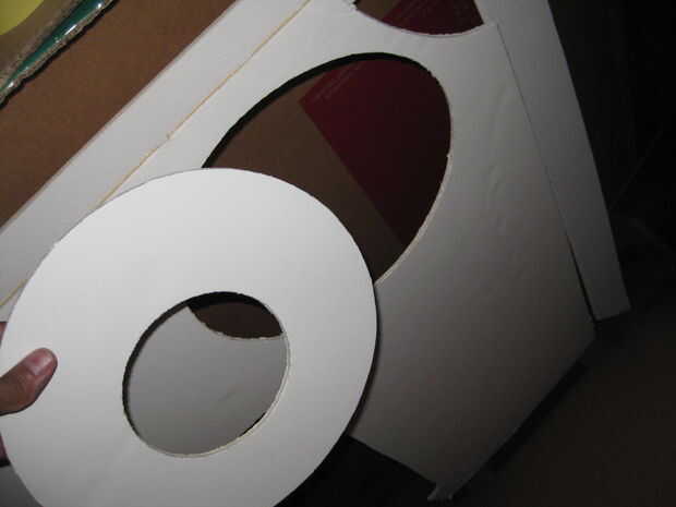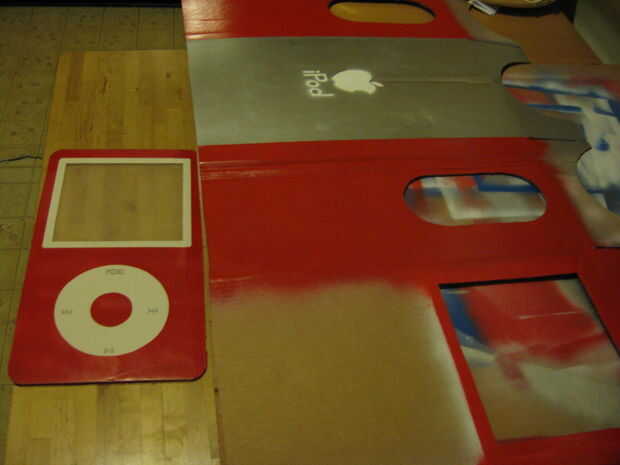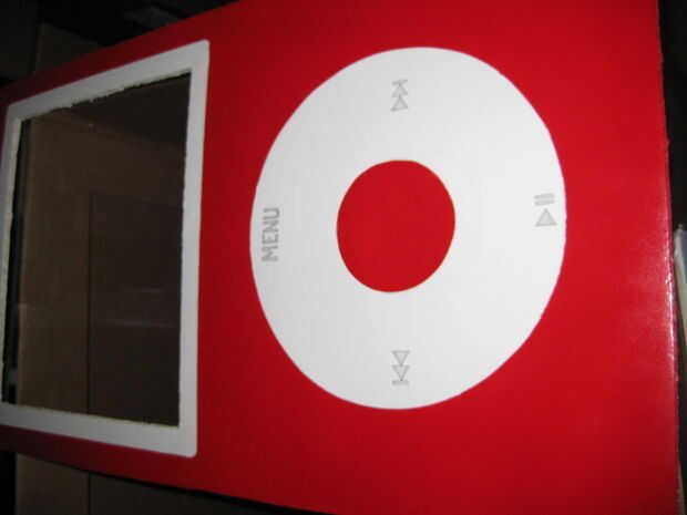 IPod rojo: Hice un anillo que se asemejaba a una rueda de papel como una plantilla, por lo que cuando pinté el tablero de la espuma roja, esta área quedaría intacto. Luego señaló a los elementos de menú en la rueda y