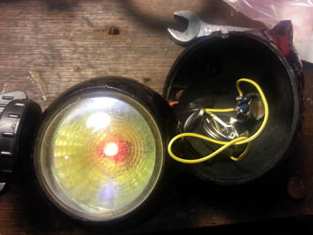 Puesto que las luces estaban rotas simplemente quitar las bombillas viejas, cableadas de un circuito de batería LED, interruptor y reloj para que el bot tiene un globo ocular inyectados de sangre rojo brillante gigante mira que.