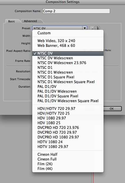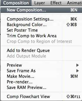 2. Haga clic en composición y haga clic en "Hacer una nueva composición". Hacer que el tamaño NTSC DV. se trata de una talla estándar.