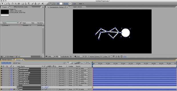 3. Haga clic en el pn de herramienta "Mover punto de anclaje" de la paleta de herramientas. Haga clic en el capa de cabeza en la línea de tiempo. Usted verá en la composición que la capa tiene un círculo pequeño con pelos de Cruz va a través de él. Este es el punto de anclaje de la capa. Este es el punto en que la capa gire o incrementará o reducirá en tamaño. que desea mover el punto de anclaje de la cabeza a donde la cabeza se une con el cuerpo. Quiere hacer lo mismo a todas las partes de la figura de palillo. Mover el punto de anclaje de la espinilla derecha a donde la espinilla se une con el muslo derecho. Ahora si se gira la espinilla derecha girará desde arriba donde se une el muslo, en lugar de rotar desde el centro de la capa que se separe del cuerpo. Repita el proceso con todos los miembros, asegurándose que los puntos de anclaje de cada parte del cuerpo donde son las juntas de caracteres.