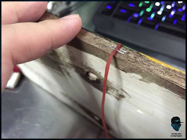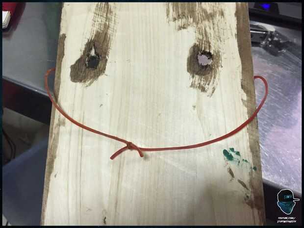 Engrape los extremos de la cuerda de goma en los bordes laterales de la tabla, alrededor de la misma altura que donde están los agujeros para los ojos.