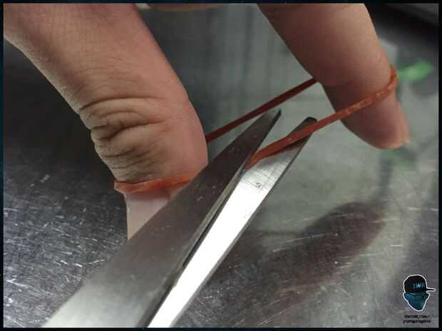 Cortar la goma para que se convierta en una cadena de goma. Até 2 piezas de gomas para ajustarse al tamaño de mi cabeza. Si tienes otras bandas elásticas o cuerdas, cortar para caber la cabeza del usuario.