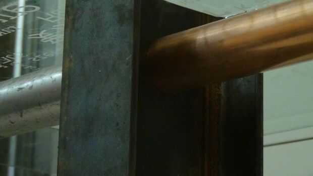 También hice arandelas rectangulares de acero plano barra para la fijación inferior, que adapta la tabla mejor que las arandelas de defensa regular que utiliza para las piezas de fijación superior (que por supuesto fueron bien con los tubos)