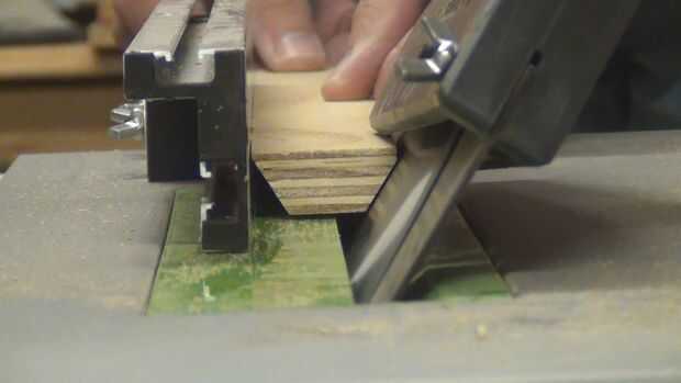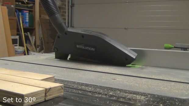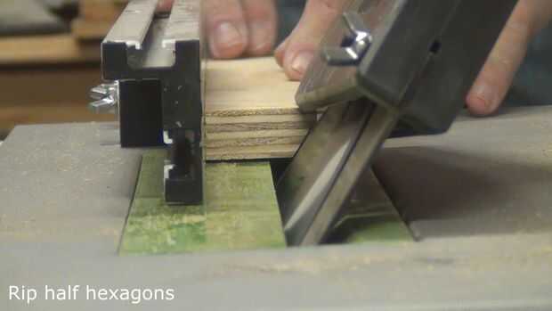 Conjunto de la mesa de sierra a 30 º y corte dos biseles en cada una de las cuatro tiras de madera, hacer un perfil de trapecio es la mitad de un hexágono