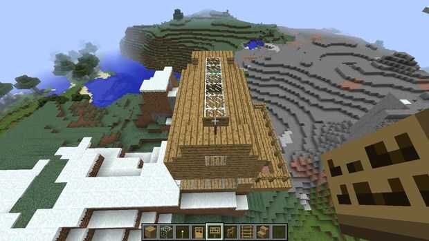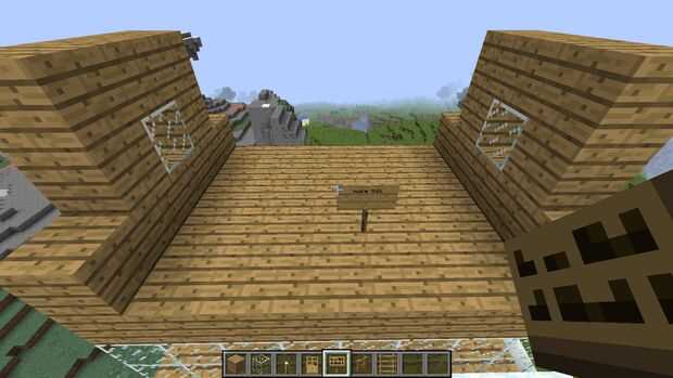 Para terminar la casa, vamos a crear la azotea inclinada. Crear la estructura de lado en la parte izquierda y derecha del techo con una ventana agradable en el centro. Después de esto cerrar el techo en el medio con bloques de madera. Y acabado con una capa de bloques de vidrio.