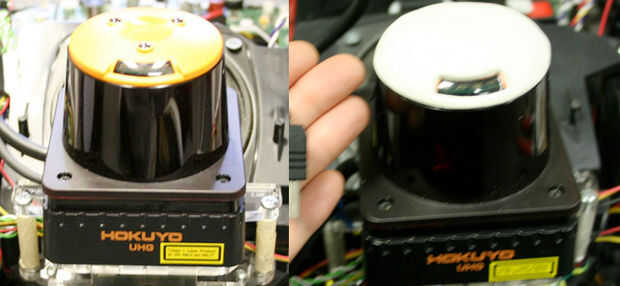 El láser no se ajusta dentro de la base, por lo que el panel superior de la base tuvo que ser dremeled para caber la forma de laser, como saca de la parte superior de la base. La montura para el láser también contiene un sensor infrarrojos Sharp que se coloca en el frente de la base. Apuntala el láser utilizando orificios ya existentes en la base y algunos planos horizontales y verticales que se enclavija. La parte superior del laser es de color naranja, pero añadiendo una capa de blanco Sugru encima coincide con el esquema de color liso y aspecto del robot VGo.