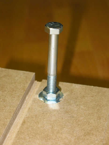 Ahora, aquí está la parte difícil. Para fijar la tuerca en T tienes que martillo en la madera prensada. Hice esto tomando un perno hexagonal de 2" y atornilladas en el T-nut (primero poner una tuerca para regular en el perno hexagonal usar como tope, prevención de daños a las roscas de la tuerca de T). A continuación, tomé un martillo y golpeó repetidamente la cabeza del perno hexagonal hasta que fue fijado correctamente.