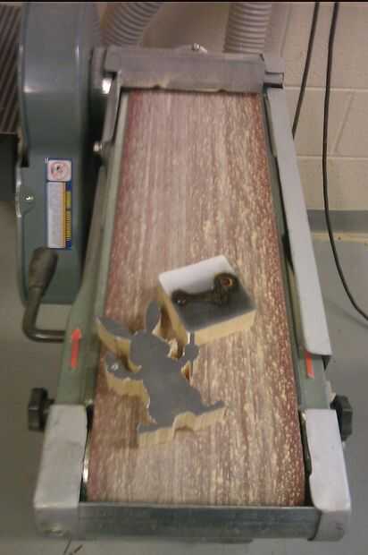Ahora tiene una imagen, se puede ver blanco alrededor de los bordes, ha quemado papel en él - parece clase de bruto. Aquí es donde sucede la magia real. Poner en marcha su lijadora de banda (pero se podría utilizar una lijadora de Palma si le falta uno) y coloque el lado de papel hacia abajo, revise la pieza de trabajo regularmente aplicando presión donde hay papel todavía, hasta que se quite todo el papel.