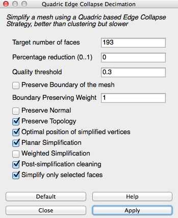 Por defecto meshlab ofrecerá reducir los detalles en un 50%. En este caso me parece bien. Experimentar con los números. Sólo asegúrese de que guarde sus pasos, por lo que se puede volver. Meshlab no tiene deshacer!