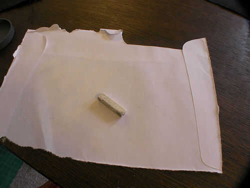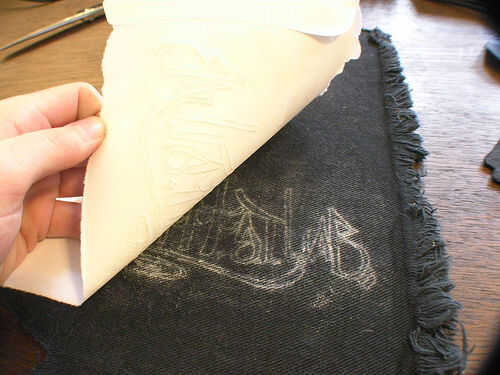 Si remontar su diseño directamente sobre la tela, omitir este paso. Girar la plantilla de papel y lápiz tiza o conti se aplican a la parte posteriora (en un color que será visible en la tela). Sacudirse el polvo y coloque la plantilla de papel sobre la tela. Trazar sobre el diseño con un lápiz opaco o un bolígrafo, transfiriendo las líneas del diseño sobre la tela. Tenga cuidado de no tocarlo mucho después de esto, como la tiza se frotará apagado con su toque.
