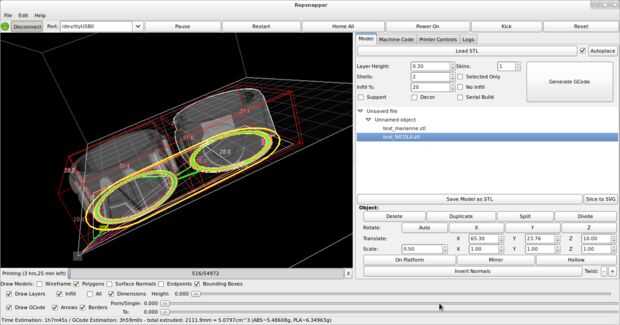Ahora, puede ejecutar '. / make_all_scad.sh' y enviar todos los archivos STL (después de comprobarlos!) fuera a imprimir, o pueden cargar en el software de la impresora 3D para imprimir. Yo uso repsnapper, que le permite seleccionados varios modelos para imprimir, y que automáticamente ponen hacia fuera en el área de construcción!