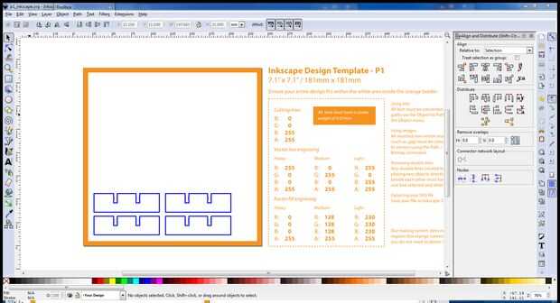 Uso el servicio de corte láser de ponoko para cortar rodajas de mi prueba. Si utiliza un láser diferente corte servicio siga sus instrucciones. Para el resto de este paso que voy hablando sobre plantilla de inkscape de ponoko. Descargar plantilla de inkscape de ponoko desde aquí. Usé la plantilla de tamaño 18x18cm p1. Abierto el sector exportados svg en inkscape, seleccionar todo (ctrl-A) y copia (ctrl-C). Abra la plantilla de inkscape de ponoko y pegar el segmento (ctrl-v). Porque el objeto de prueba es cuadrado puede simplemente pegar en tres rebanadas más para tener un total de 4. Arreglar las cuatro rebanadas en una cuadrícula de 2 x 2 bruto. Quieres las rodajas todo bien espaciados y alineación así que su menos movimiento para el láser. Abrir inkscape alinea y distribuir diálogo (shift-ctrl-A) Seleccione las 2 rebanadas izquierdas y haga clic en centro en eje vertical haga lo mismo para los sectores de la derecha 2. Hacer una cosa similar pero horizontalmente. El resultado final es 4 rebanadas bien alineadas según la captura de pantalla.