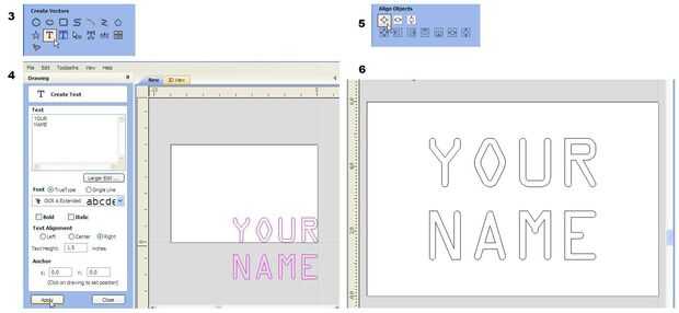Para centrar el texto en su pieza, seleccione el texto haciendo clic en él y haga clic en el icono "Centro de Material" en el menú "Alinear objetos" (5)