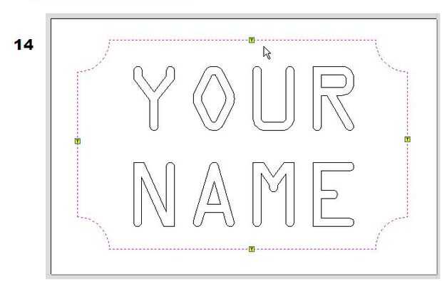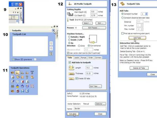 Establecer la longitud y el grosor, marque la casilla "Crear pestañas 3D" y haga clic en "Editar fichas": aparecerá el menú de "Fichas de trayectoria" (13); Seleccione "Número constante" y anule la selección de los demás. Añadir pestañas de golpe y coloque 4 fichas en el borde según la figura 14. Haga clic en cerrar, llame a la trayectoria como te gusta y haga clic en calcular.