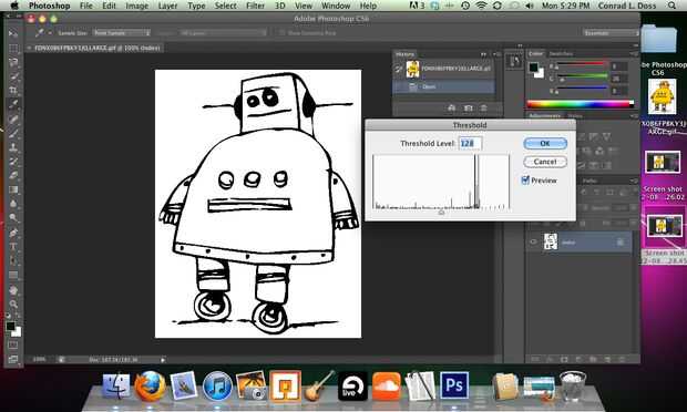 después de cargar por búsqueda de umbral y haga clic en él. O vamos a imagen > Ajustes > umbral.  Al hacer clic en él la imagen deben girar a blanco y negro y una ventana debe saltar.  Hay una barra deslizante en la parte inferior del gráfico como mira lo que le permite controlar la intensidad de la misma. Deslice la barra a su gusto y haga clic en Aceptar.