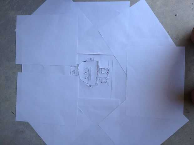 Usando un pedazo de cinta adhesiva, cinta adhesiva una hoja de papel en la parte posterior de la plantilla en la parte superior así que manténgalo presionado y ser más fáciles de bajar. Luego llevarlo hacia fuera de lado o donde quiera y ponga hojas de papel por encima y todo alrededor de la plantilla para proteger el producto final y el suelo de ser etiquetadas. No tienes que usar tanto papel que acabo de ir papel loco: 3 después todo es pintura en spray ligeramente la plantilla, no va sobre el tablero o arruinará la plantilla y se purga a través del papel.