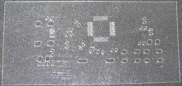 La calidad y precisión de las plantillas resultantes es buen prototipo 0805 y TQFP (paso de 0,8 mm) tamaño de componentes electrónicos.