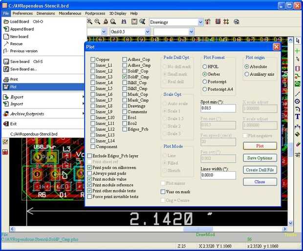 Si utiliza KiCAD, seleccione trama en el menú archivo . En la ventana de Diagrama , seleccione SoldP_Cmp para capa de componente de goma de la soldadura y haga clic en el botón Plot .