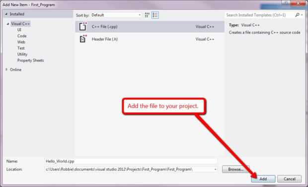 Después de haber seleccionado la opción de archivo de C++ y nombre de archivo, seleccione el botón Agregar en la esquina inferior derecha de la ventana. Esto es que detrás del proyecto de la pantalla y agrega el archivo .cpp al proyecto.