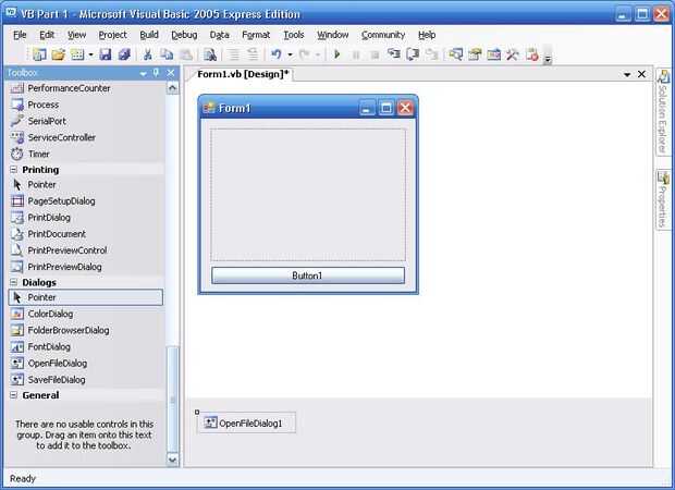 De la caja de herramientas, arrastre un cuadro de imagen al formulario, arrastre un botón al formulario y arrastre un cuadro de diálogo abrir el archivo de tu formulario.