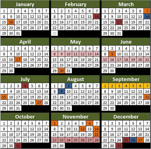 Lo más simple sería fijar una fecha y hacer con ella, pero quisiera más bien que la fiesta siempre cae en un sábado. Parece mejor así. Decidimos hacer la fiesta el primer sábado en septiembre, lo que significa que puede caer en 1/9 al 9/7. Utilizando una regla de fecha simple, podemos reducir la fecha a cualquier siete fechas consecutivas que queremos. Por ejemplo, si hubiera querido el 8 a 14, habría utilizado el segundo sábado del mes. Si quería el 3 Aunque el 9 pude han utilizado el primer sábado después de un jueves.