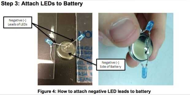 Ahora que los conductores negativos se sueldan juntos y el lado negativo de la batería, voltear la pila boca abajo en el lado positivo. Con un poco de reposicionamiento, alinee los dos cables positivos de los LEDs para que forman un pequeño cruce cerca de las puntas. Aplicar soldadura a este punto de intersección, pero no la soldadura lo positivo conduce a la batería, de lo contrario el LED constantemente permanece encendido. Repita este proceso con la otra batería.