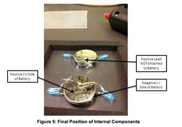 Coloque las dos pilas con sus respectivos LEDs conectados a la pieza de acrílico con la cinta de aislamiento de espuma con el lado negativo de las pilas hacia abajo como se muestra en la figura 5. A continuación, usar una pistola de pegamento caliente, Aplique pegamento en la parte inferior de las pilas (el lado negativo) según sea necesario y ajuste la colocación de la batería de modo que las baterías están a niveles con el resto de la pieza de acrílico y los LEDs frente a las cuatro esquinas de la Plaza.