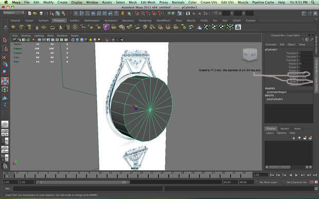 Todo derecho tiene un diseño y diamante en mente, su tiempo para modelar su anillo. Utilicé un software de animación/modelado 3d Maya... otros programas, libre ediciones, de aprendizaje y tutoriales pueden encontrarse en línea.