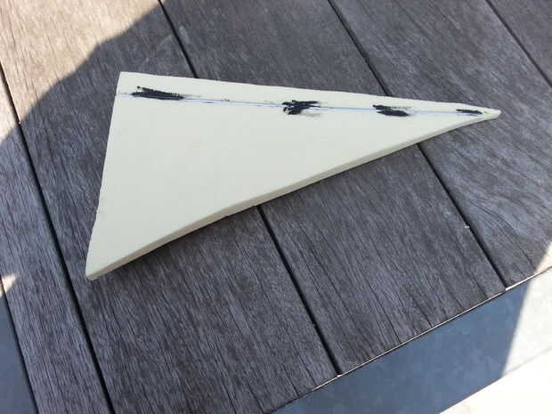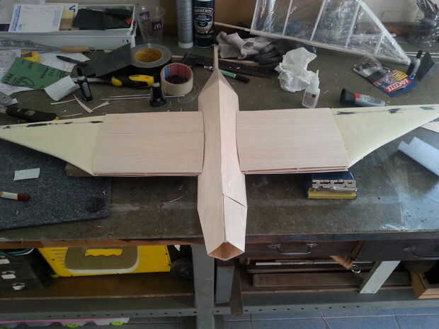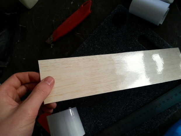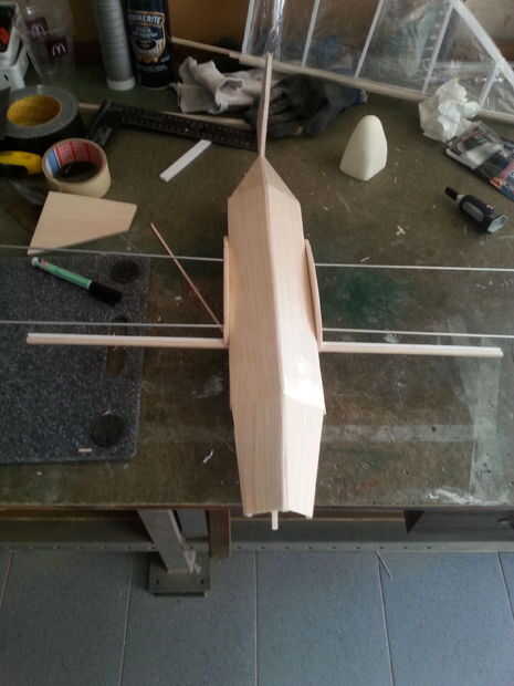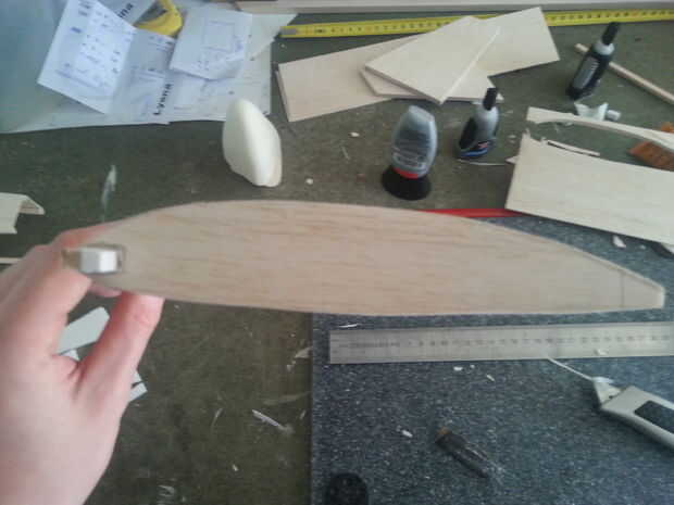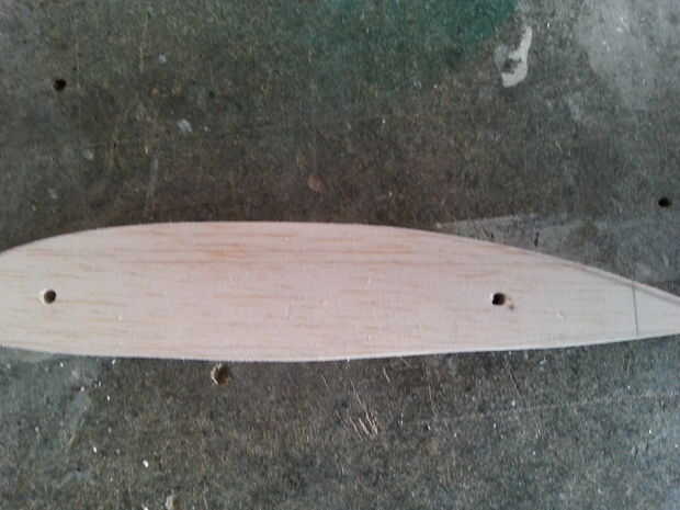 - Corte una lat de madera de balsa de 5mm una lat de 50 cm. cola depron en este lat con el mismo ancho y largo. La longitud de las piezas rectas en ambos lados son 20cm y el fuselaje es de 10 cm de ancho.