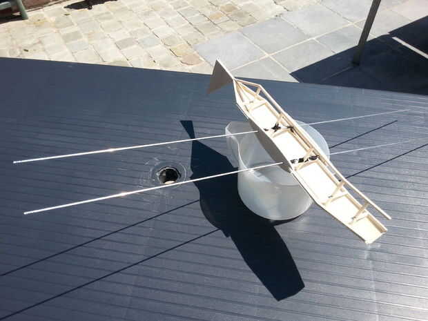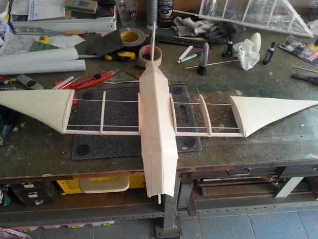 5 poner 2 tubos de aluminio de 1m a través del fuselaje, asegúrese de que la una en la parte delantera es de 9cm desde el frente del balso recto lat. madera Asegúrese de tener 50 cm en ambos lados. Pegar los tubos con el fuselaje con la silicona.