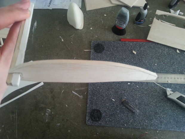 - Utiliza tu tabla de balsa de 5 mm. usted necesita las 6 costillas en total. Esta tienen una anchura de inicio y final de anchura de 1cm, la parte superior hace una curva de máximo 2cm (medido del bottem). El bottem es una curva de 1,5 cm medidos desde la parte superior. Corte un pedazo rectangular de 6mm de alto y 1,1 cm de profundidad.