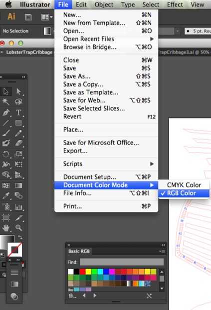 Lo primero que quieres hacer es asegurarse de que todas las líneas y las medidas están en pulgadas. En segundo lugar, asegúrese de que el modo de color es RGB para el documento. Y al elegir colores/muestras a utilizar RGB básico, esto facilita la exportación y leer/manipulado por el software del láser. Todas las líneas incluyendo movimientos de texto necesitan ser 0.001. pulg. con el fin de ser leído por el láser. Dependiendo del láser y el programa que usas puede no reconocer una amplia paleta de colores. * Conocer a su láser *