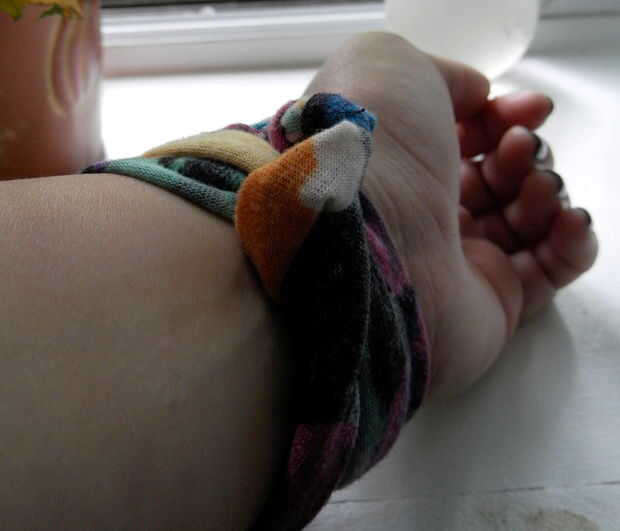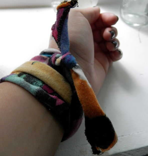 El material de la herida alrededor de mi muñeca un par de veces y utiliza un nudo sencillo para atar juntos. Meter los extremos sueltos debajo del material para un aspecto más ordenado. Admiro tu trabajo!