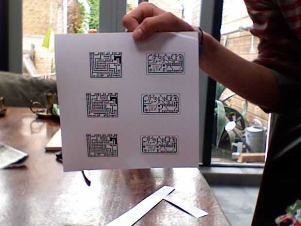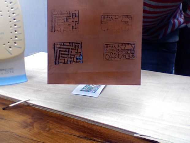 Imprimir el diseño en el papel brillante de la foto. Utilicé papel fotográfico brillante de Canon para esto. No vaya demasiado costosa, sólo barato papel brillante. Asegúrese de imprimir en una impresora láser. Imprimir el diseño de 2 o 3 veces en la misma hoja, así que usted tiene una impresión extra si algo sale mal. Ahora usted puede comenzar a limpiar la placa de cobre. Use una esponja y algo de grasa eliminación de líquido limpiador. Asegúrese de limpiar el cobre y no tocarlo con los dedos (o cualquier otra cosa que podría poner grasa en el cobre), que podría dar algunos problemas al planchar el diseño en. Después de que se haya limpiado y secado el copperboard puede empezar a calentar la plancha. Utilice el ajuste más caliente que tiene la plancha. Coloque el diseño sobre el copperboard (sí con el toner hacia la Junta 0.o) y coloque la plancha caliente sobre. Aplicar un poco de presión y asegúrese de que el papel no se mueve ya después de esto. Mantenga la plancha en lugar de alrededor de un minuto. Entonces cuidadosamente empezar moviendo la plancha sobre el papel, todavía asegurándose de que el papel no se mueve. El proceso entero generalmente me toma unos 10 minutos. Si usted piensa que el tóner es transferido a la copperboard, tomar de la plancha y sentir si el papel se une al cobre o no. Si viene suelto realmente fácil, solo tomarlo, si usted realmente necesita tirar de él, todo el tablero en un poco de agua fría y con cuidado retire el papel mojado.