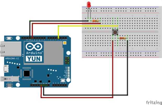 Este esquema representa la configuración de led, resistencia y pulsador. Con esta configuración cada vez que pulse el botón, el LED se enciende y apaga.