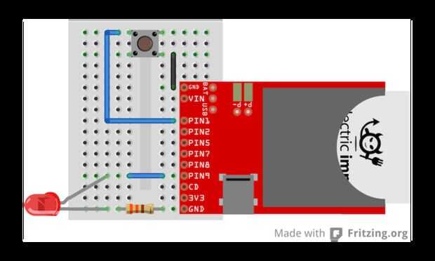 Este esquema representa la configuración de led, resistencia y pulsador. Con esta configuración cada vez que pulse el botón, el LED se enciende y apaga.