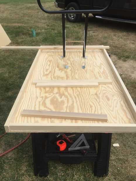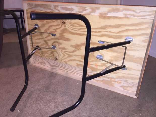 - En este ejemplo, decido mantener el nuevo refuerzo en las patas plegables de 4" desde el borde más cercano de la plataforma. Esto le dio las piernas suficiente espacio para doblar hacia fuera y no chocar con los demás. Lo mismo se hizo para el otro en la otra pieza principal. (Ve arriba)