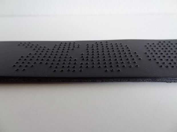 El patrón de la piel con cinta scotch la cinta y marca los agujeros con un imperdible. Esto hará que sea más fácil de perforar. Taladre los orificios (yo usé un 3/64 pulgadas, taladro 1mm) tengo acceso a un taladro de columna, pero puede hacer fácilmente con un destornilladores eléctricos. Perforé con la más alta velocidad y la pulsera ponen en la parte superior una poco la madera contrachapada. I did ' t fijar el cuero pero Presione hacia abajo con las manos en la superficie de la madera por debajo.