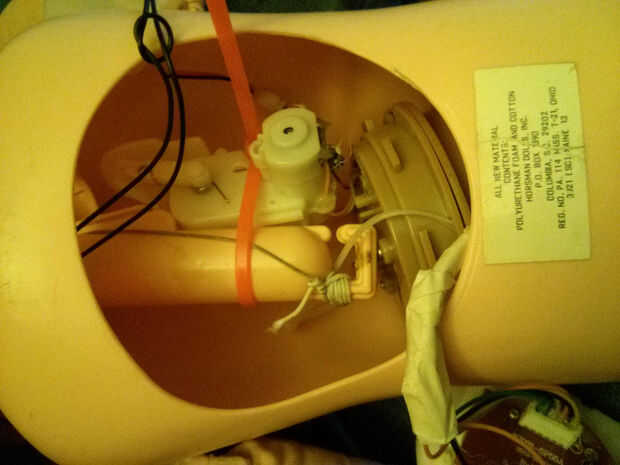 A continuación tengo el motor en la cavidad del cuerpo y capaz de mover la cabeza. Cabe bastante fácilmente y utilicé una combinación de lazos de cremallera y una pequeña barra de metal para sujetar el motor y la palanca de control. No había mucho de puntos duros en el motor podría montar cosas, y el motor utiliza una fuerza giratoria que podado cualquier pegamento de até la pieza metálica del palillo de control, luego creado lazos en el motor y pasa por allí. Esto también me dio la capacidad de tomar las cosas en y hacia fuera según sea necesario.