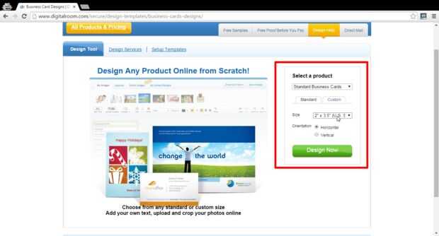 Mayoría de los productos impresora se atribuye con elementos como tamaño o dimensiones y la orientación. Este paso es bastante sencillo de entender, todo lo que tienes que hacer es establecer su tamaño y orientación para tus tarjetas de visita estándar y haga clic en el botón diseño ahora. También puede establecer tamaños personalizados para tus tarjetas de visita limitadas mínimos 2 pulgadas y 4 pulgadas máximo. Esto es tanto para la longitud y la altura.