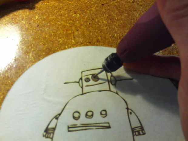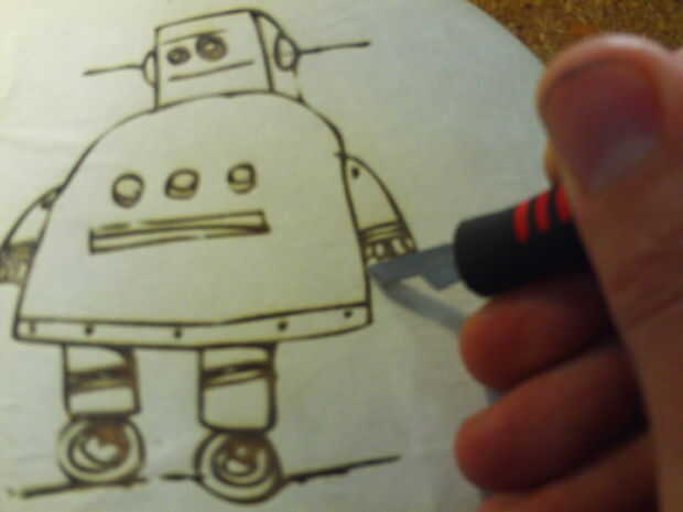 Tienes varias opciones para este paso: dibujar algo con un marcador; cinta una copia impresa en blanca y negra de la imagen sobre el acrílico; enviar una imagen digital a un lugar que hace grabado (ver Ponoko): http://www.ponoko.com/make-and-sell/design-it-yourself