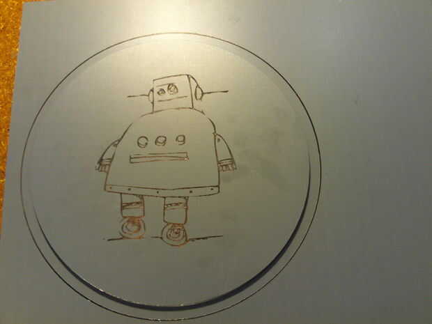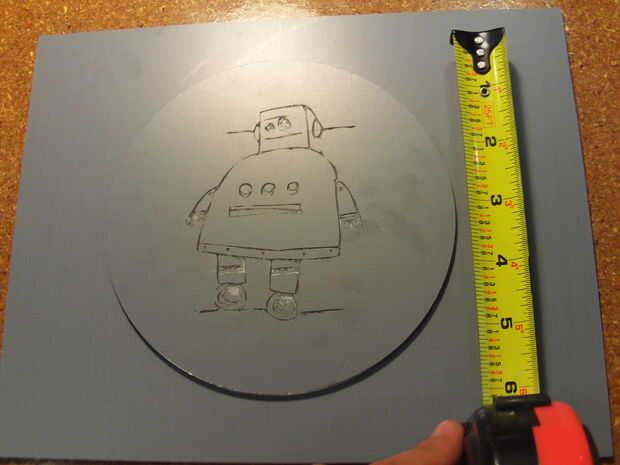 Luego la 2 º pieza de acrílico sin tocar se convertirá en el anillo interno. Arte esta poniendo su arte disco (o dibujar un círculo de 6 pulgadas con una línea punteada para que lo represente) en el acrílico y dibujar un círculo más grande centrado alrededor de su obra de arte que 1 pulgada más de diámetro. Quitar el disco de arte y dibuje un círculo interno que 2inches arrendador de diámetro, que el previo le círculo sólo dibujó. Así que te queda con un anillo interno que se superpone su disco de arte y el anillo exterior. Este anillo interior oculta la tira del LED... que es nuestro próximo paso!